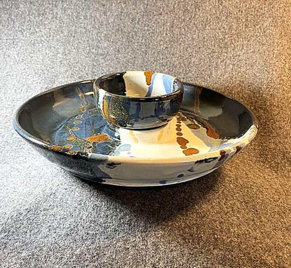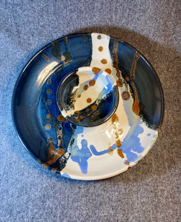 This 2 piece Dreamscape shrimp and dip server was made with white stoneware. After the bisque firing the Dreamscape glaze pattern is applied in four separate steps using Stormy Blue, Iridescent Iron, Blue Midnight and white glazes. It is then fired to cone 6.